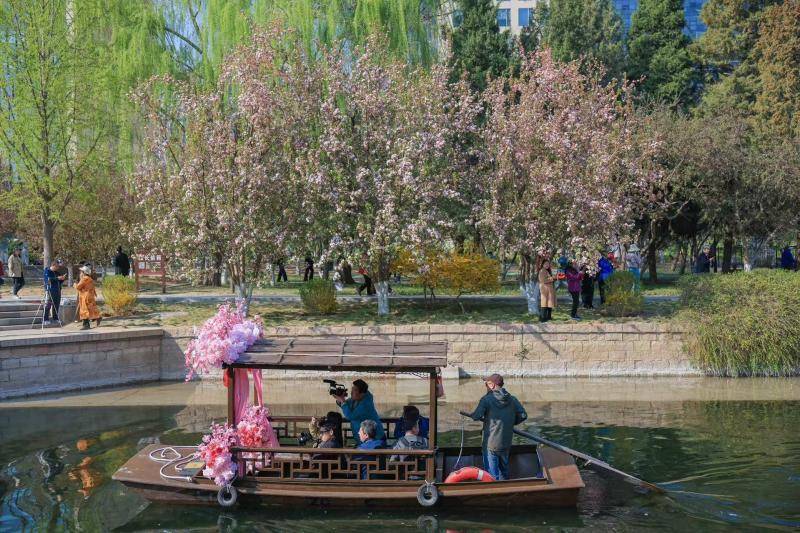 走在位于元大都城垣遗址公园内的海棠花溪,河道两旁海棠花正在次第开放,河道内水流清澈,花影树影婆娑。在小关闸,摇橹船一字排开,在做最后的装饰,“明天就会正式启航。”负责运营的相关负责人表示,乘船穿行在河道里,抬头就是垂到水面的花团,低头能看到花影映在碧波里,花瓣飘在船边,真的就是“船在水中行,人在画中游”,不出京城就能邂逅江南诗意。从水上视角,还能把元大都城墙遗址的全貌尽收眼底,一边赏春日花海,一边触摸千年古都的历史文脉。“摇橹船都是人工摇橹,没有机械噪音,能安安静静沉浸式赏花。”该负责人说。